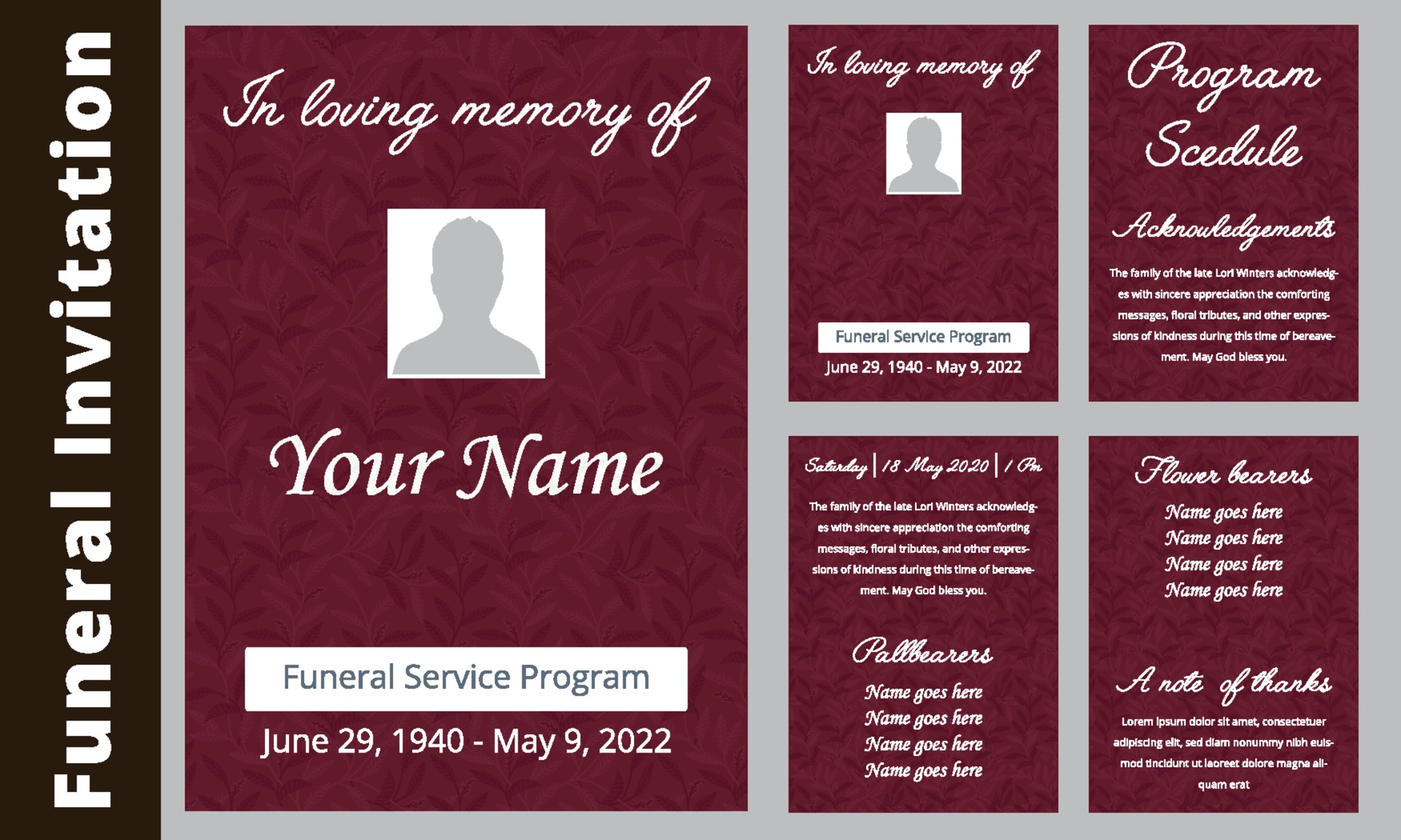 Easy to customize with hundreds of design choices. An invitation to a memorial ceremony may be included, but a simple statement that pays tribute to a life of significance is also appropriate. How to create a funeral invitation. A sombre and serious event like a funeral needs to be treated delicately and with care. Importance of funeral program template.